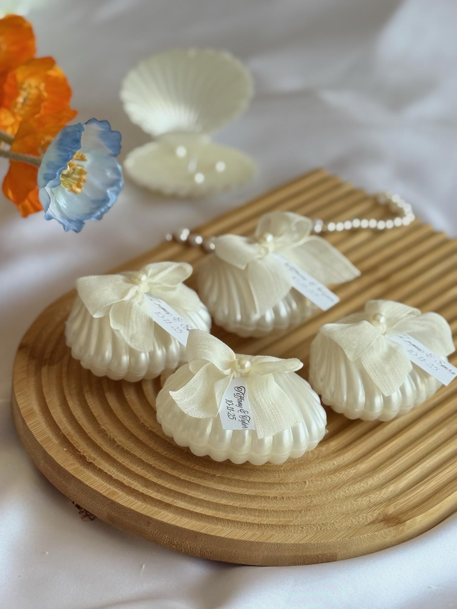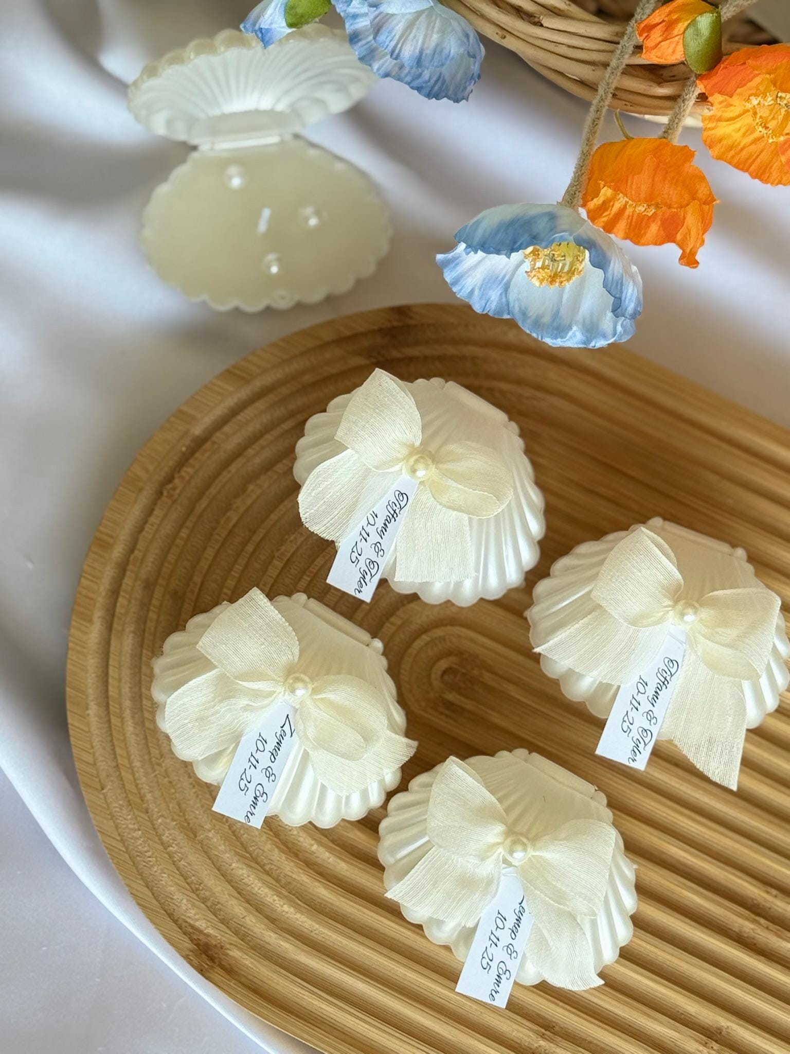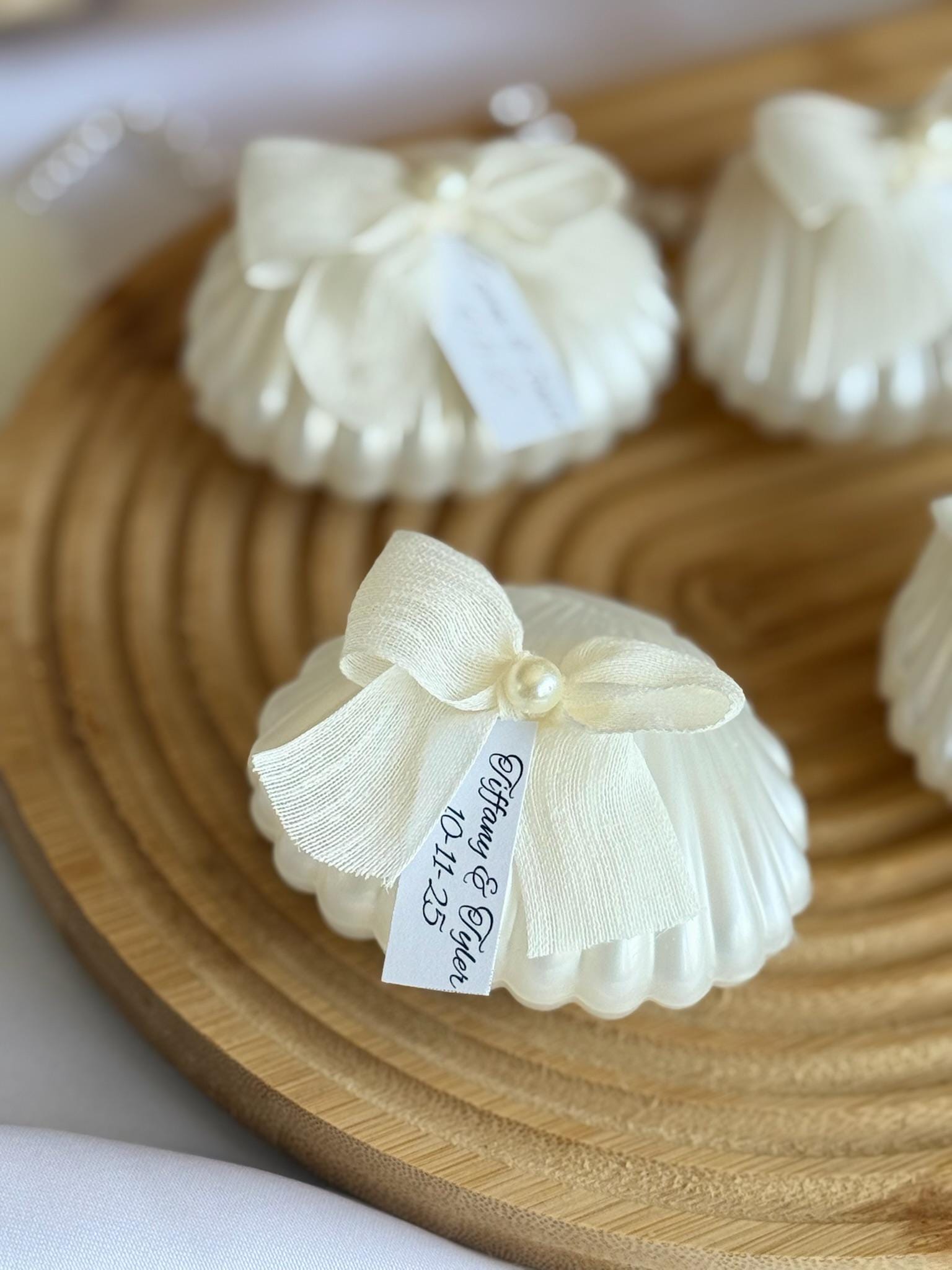 Handmade soap favors presented in a beautiful seashell-shaped clear box. Perfect for weddings, engagements, baptisms, baby showers, or birthdays. Each soap is decorated with your choice of ribbon and tag style, creating an elegant keepsake for your guests.