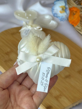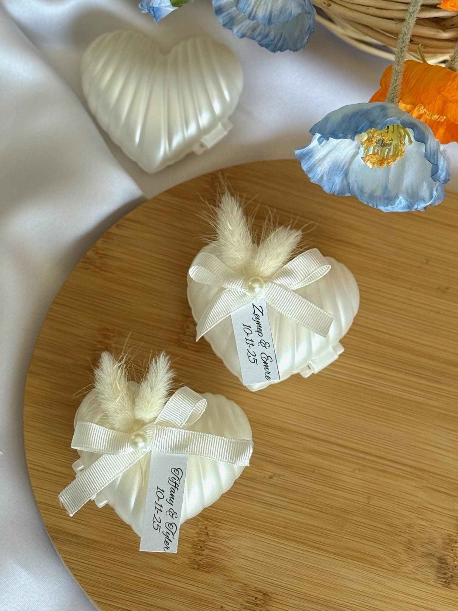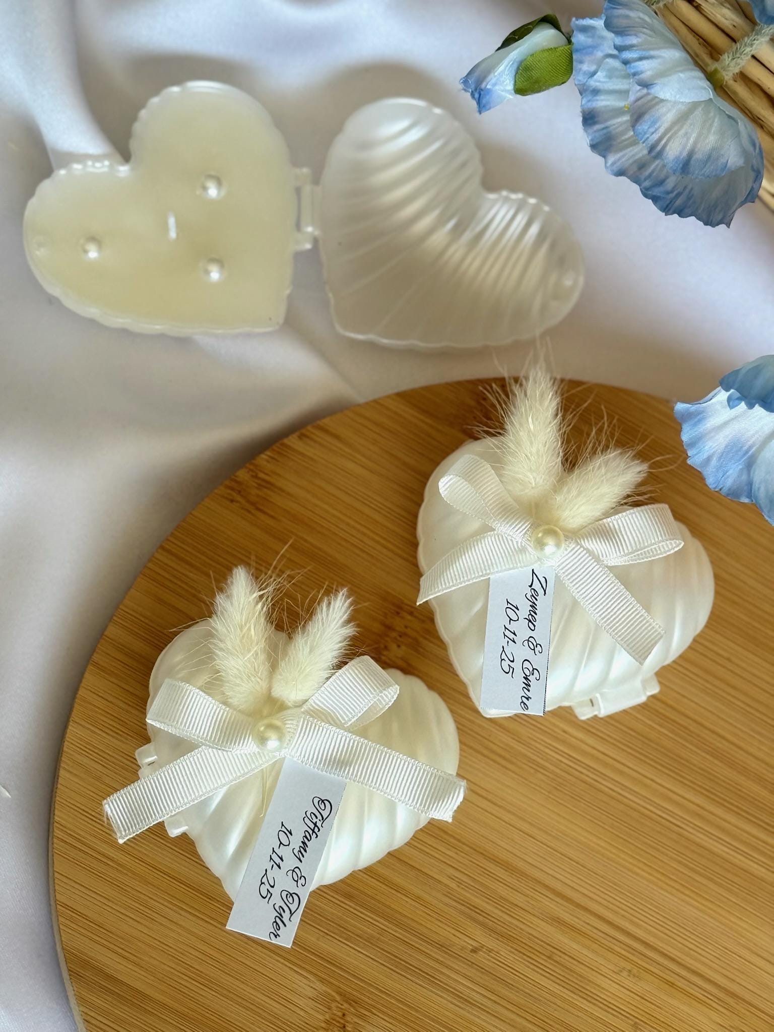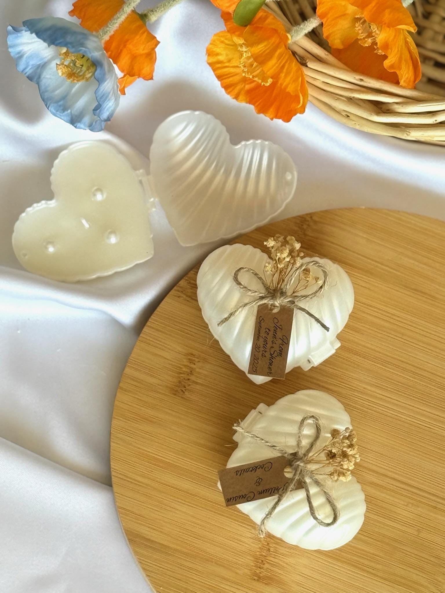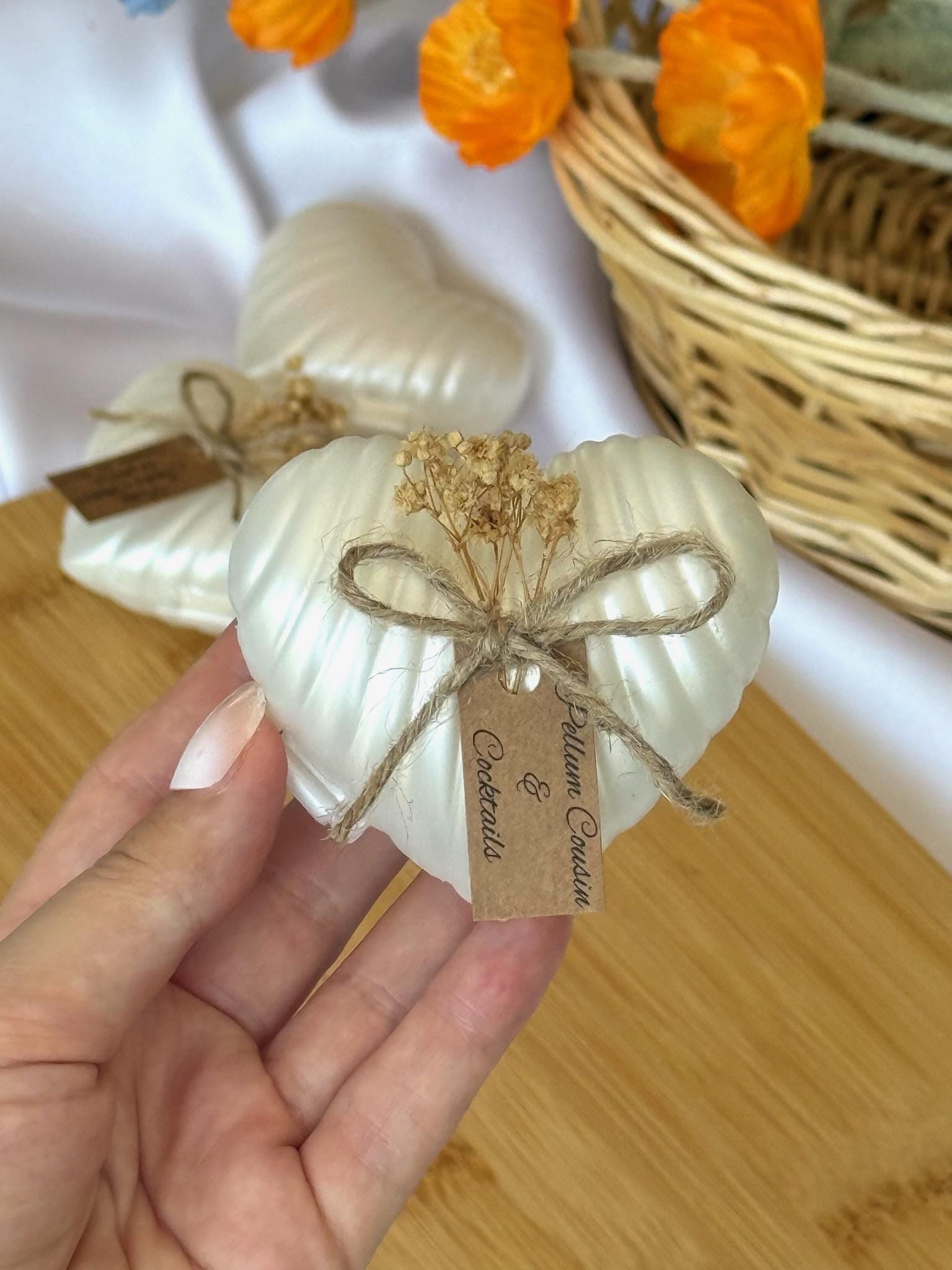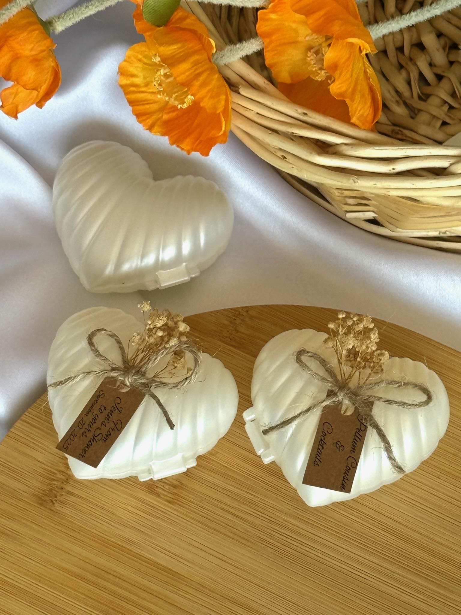 Elegant handmade soap favors in a clear heart-shaped box, perfect for weddings, engagements, baptisms, baby showers, or birthdays. Each piece is decorated with your choice of tag style, making it a beautiful keepsake for your guests.
