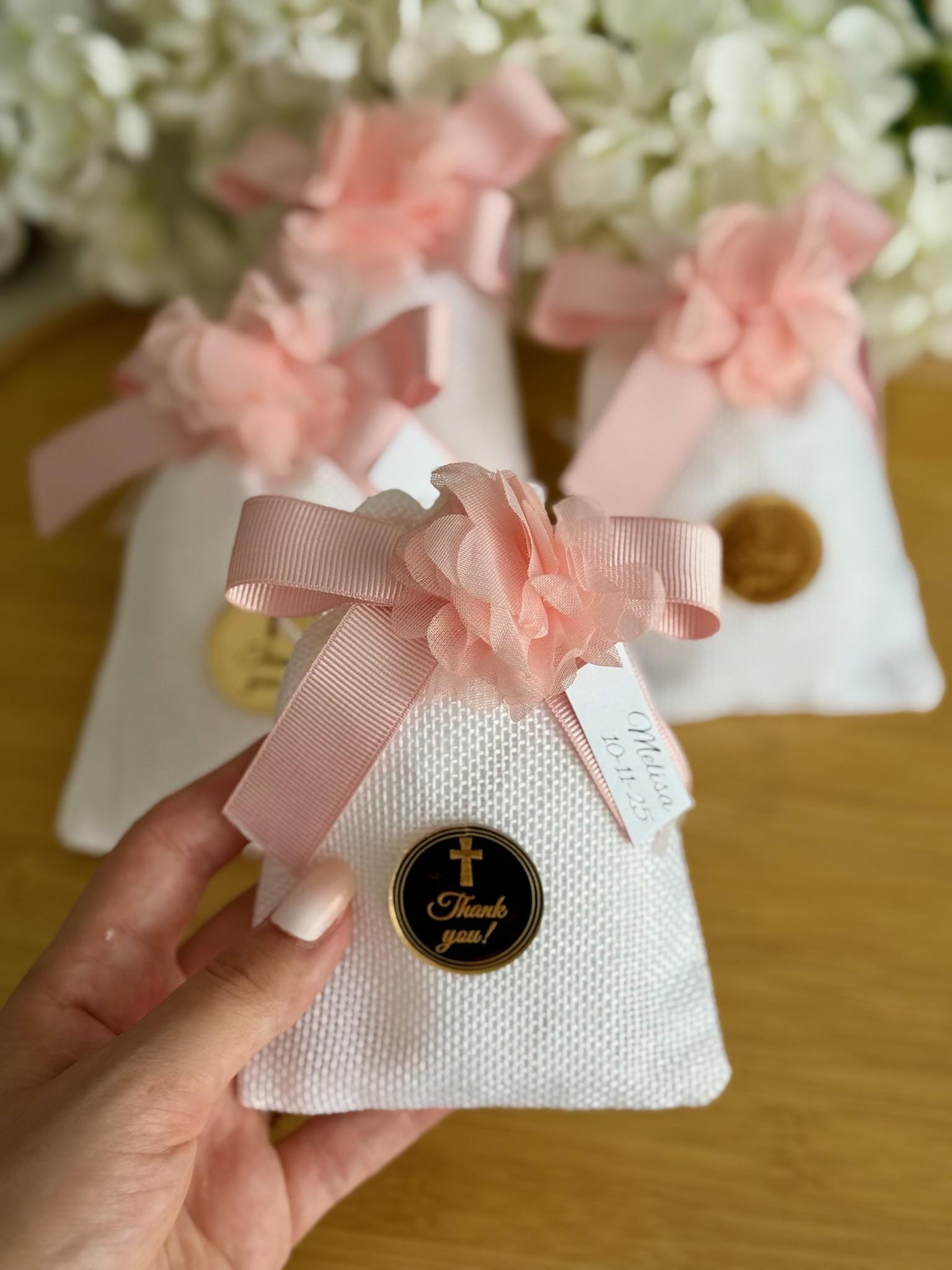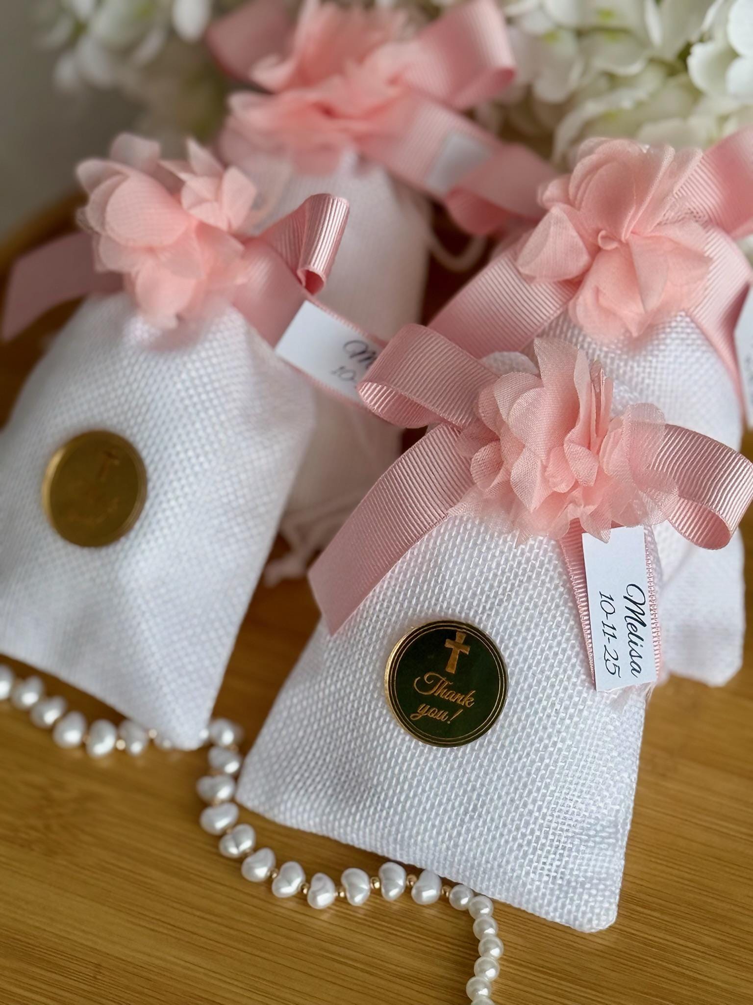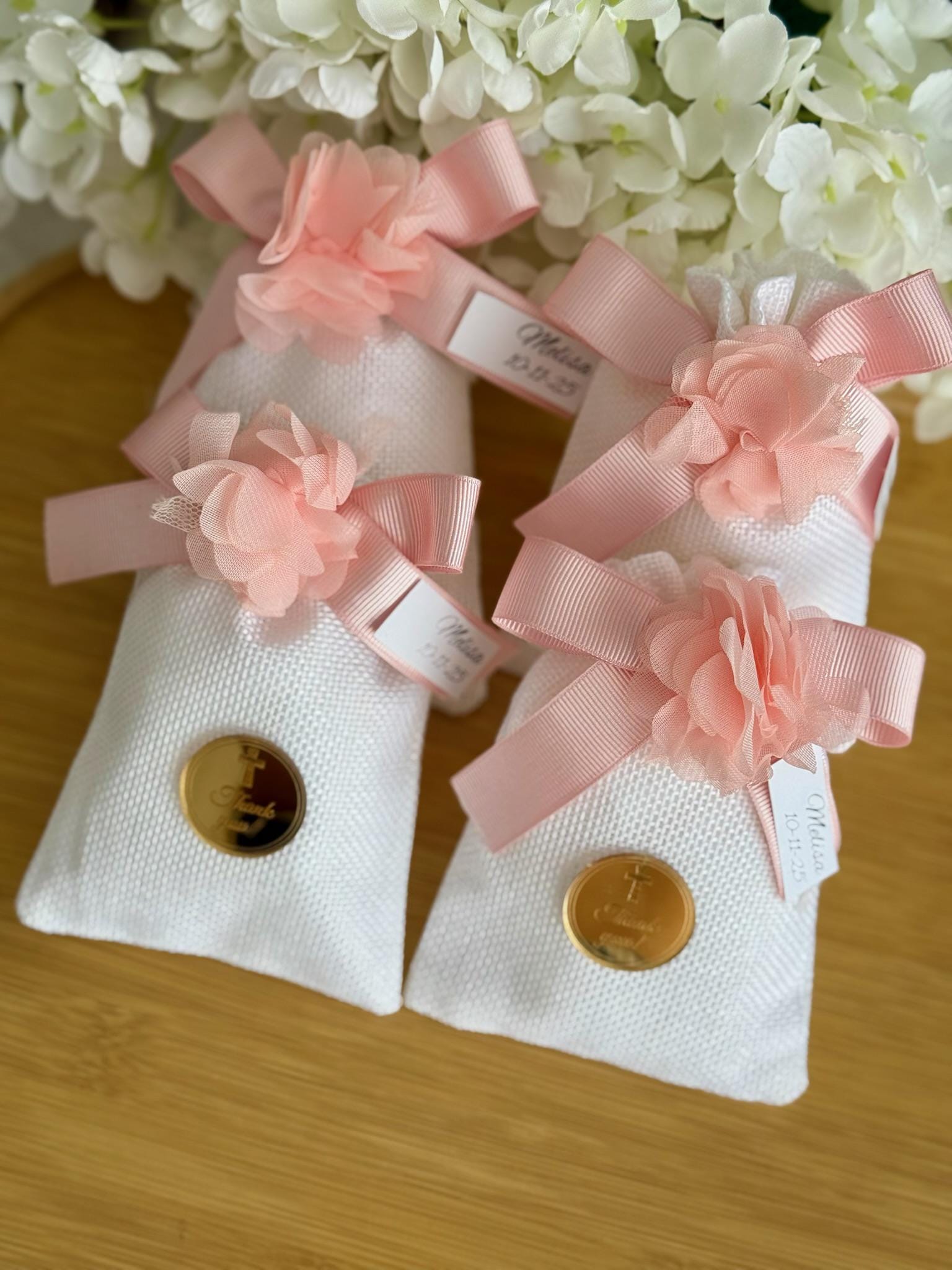 These delicate handmade sachets are the perfect keepsakes for baptisms, christenings, weddings, or baby showers. Each white fabric pouch is decorated with a soft pink bow and flower detail, and personalized with a name and date tag. A gold-colored token adds an elegant finishing touch. It can be also without cross thank you seal.