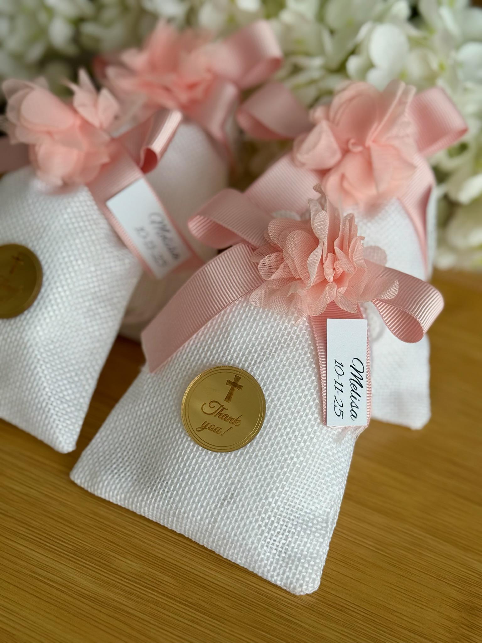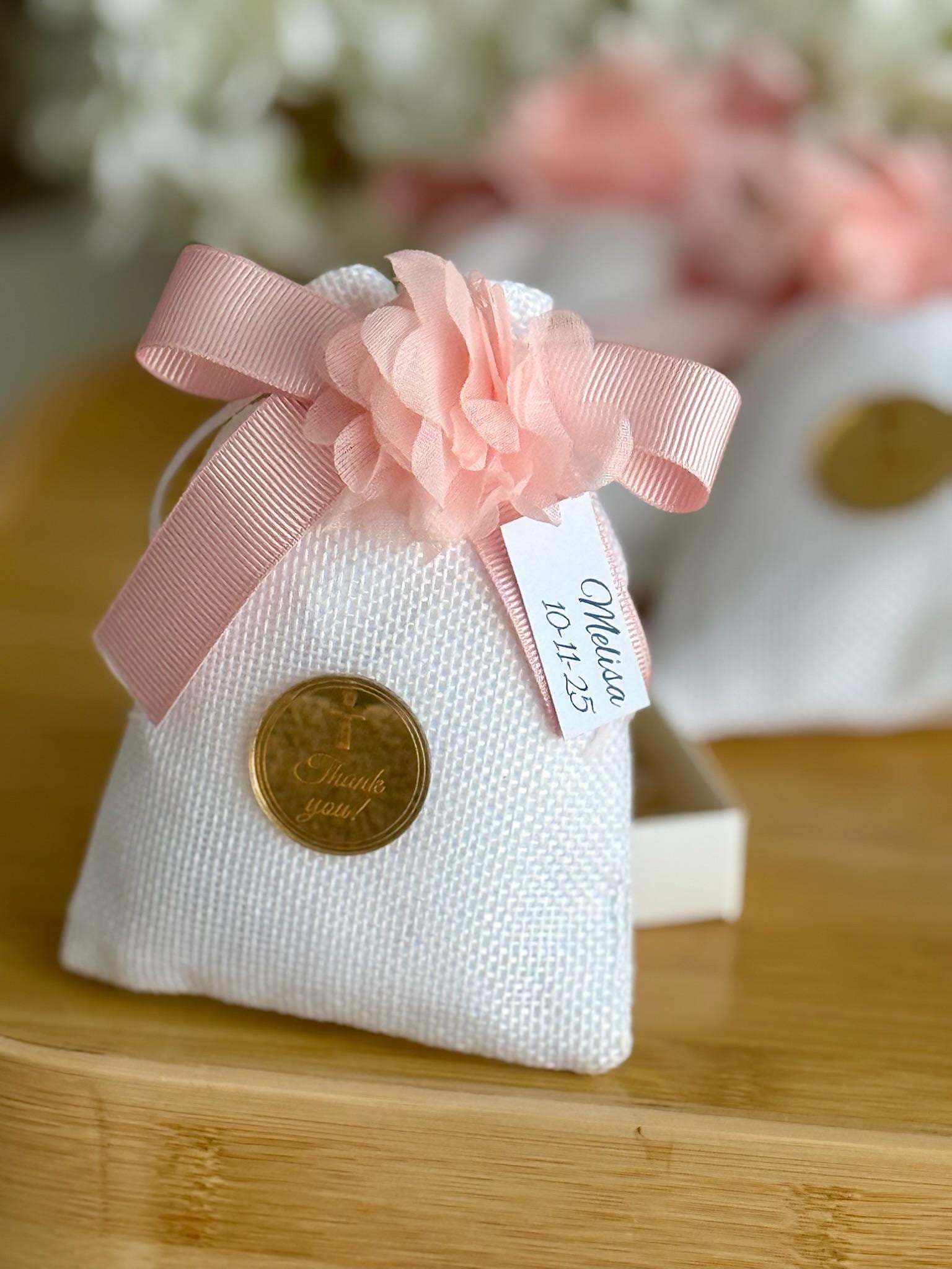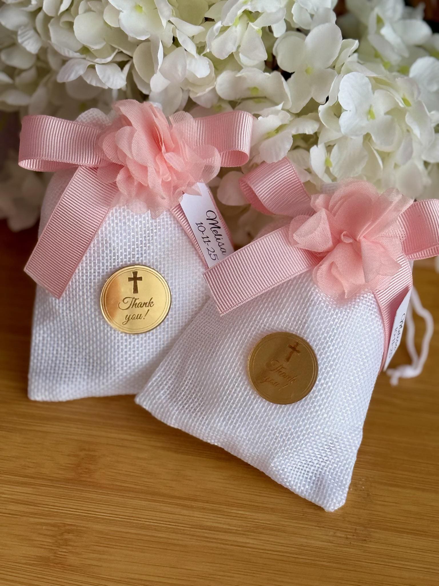 These delicate handmade sachets are the perfect keepsakes for baptisms, christenings, weddings, or baby showers. Each white fabric pouch is decorated with a soft pink bow and flower detail, and personalized with a name and date tag. A gold-colored token adds an elegant finishing touch. It can be also without cross thank you seal.