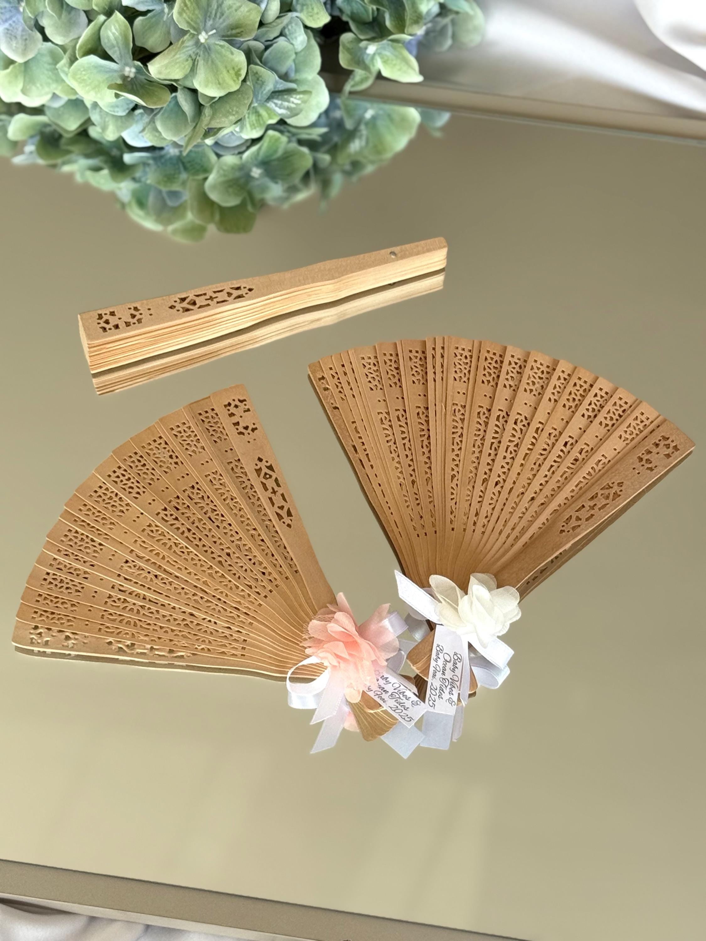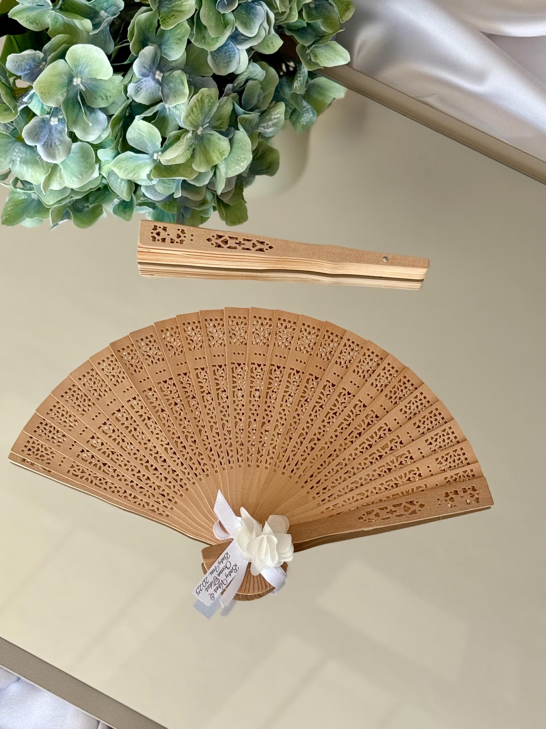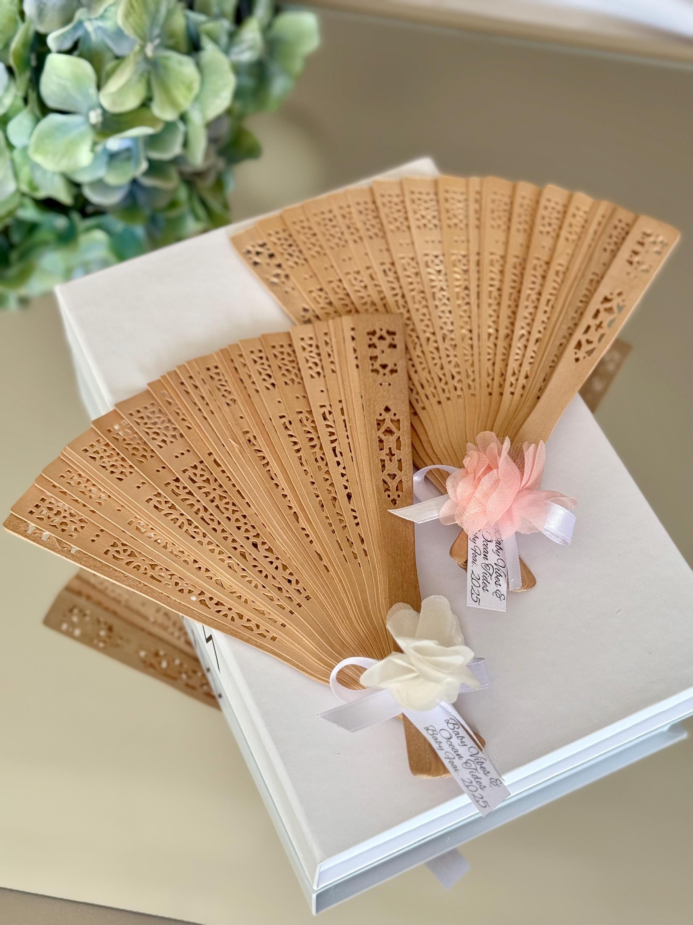 Delicately carved and beautifully finished, these bamboo hand fans are the perfect blend of charm and practicality. Ideal for summer weddings, garden receptions, or destination celebrations, each fan is adorned with a soft ribbon and a personalized tag, making it a memorable keepsake for your guests. Add a touch of grace to your big day with these timeless favors.