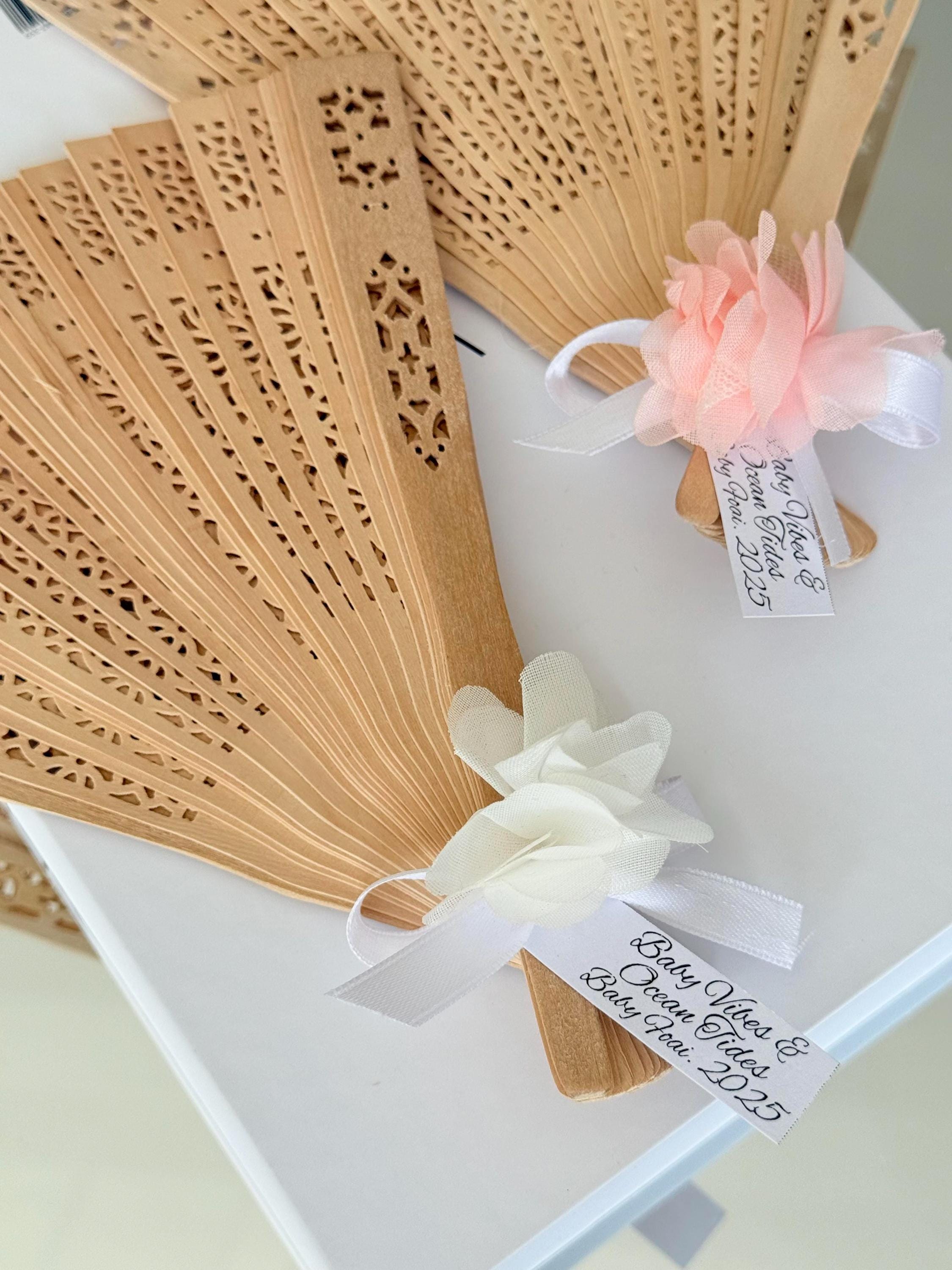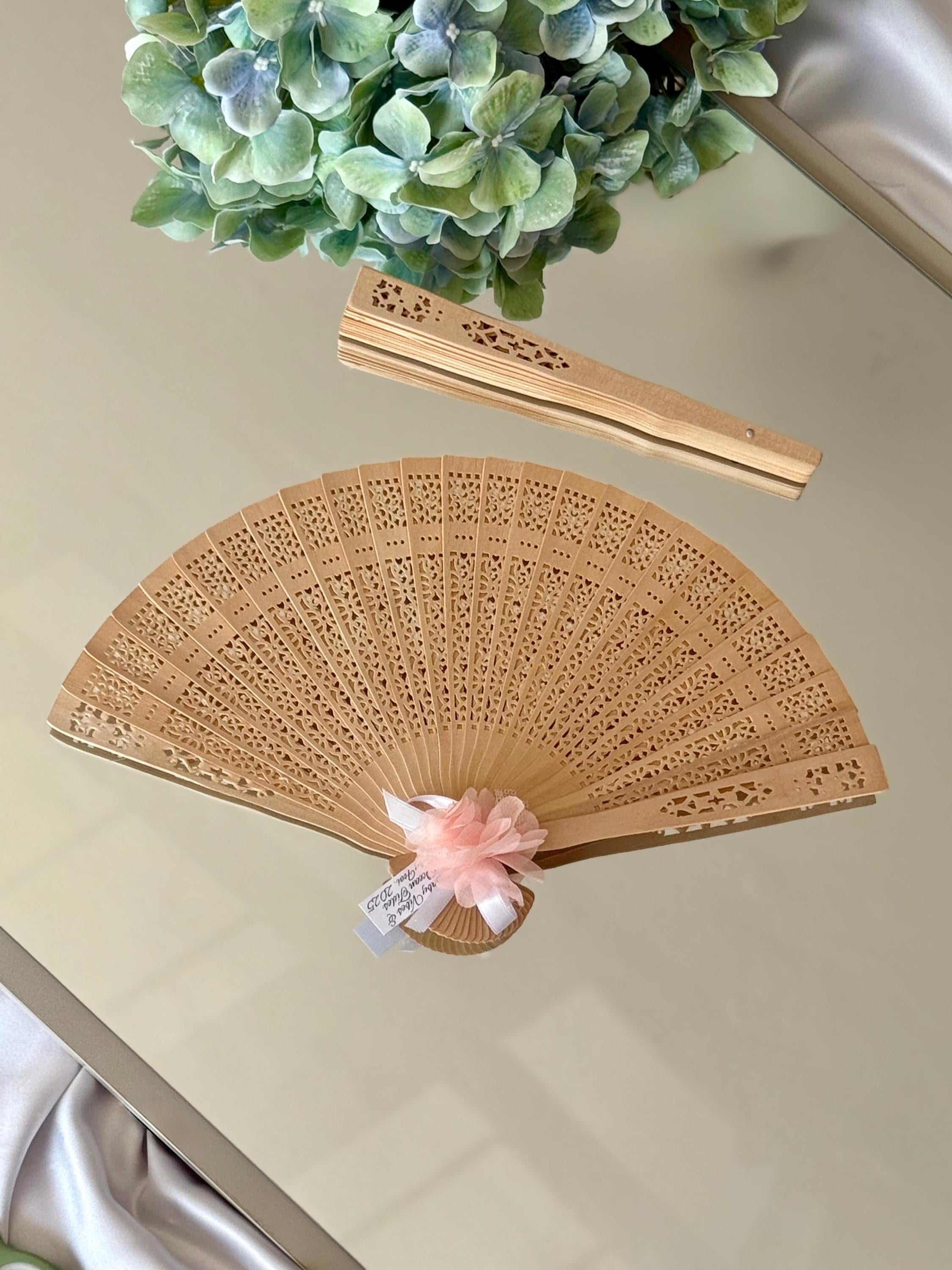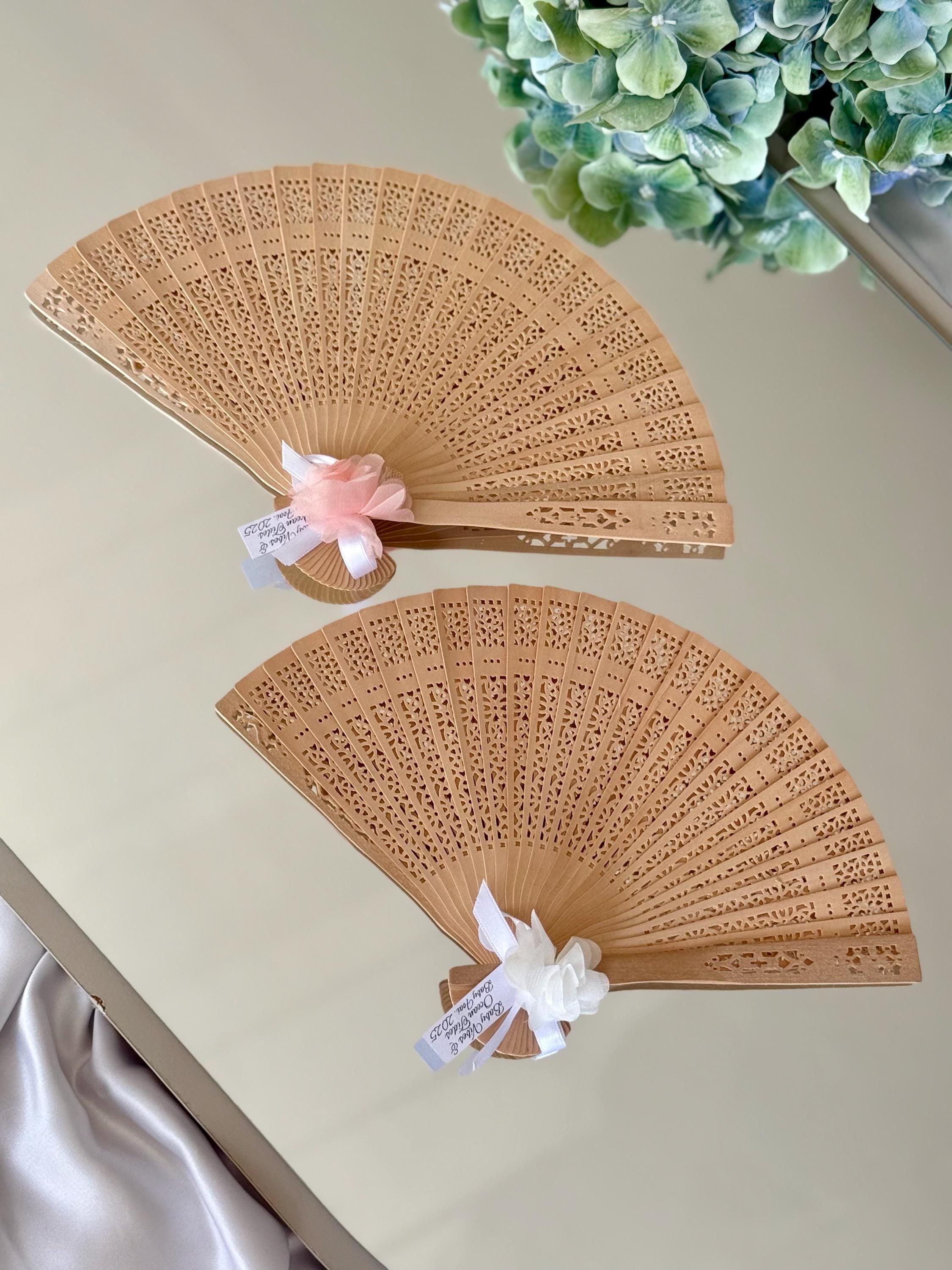 Delicately carved and beautifully finished, these bamboo hand fans are the perfect blend of charm and practicality. Ideal for summer weddings, garden receptions, or destination celebrations, each fan is adorned with a soft ribbon and a personalized tag, making it a memorable keepsake for your guests. Add a touch of grace to your big day with these timeless favors.