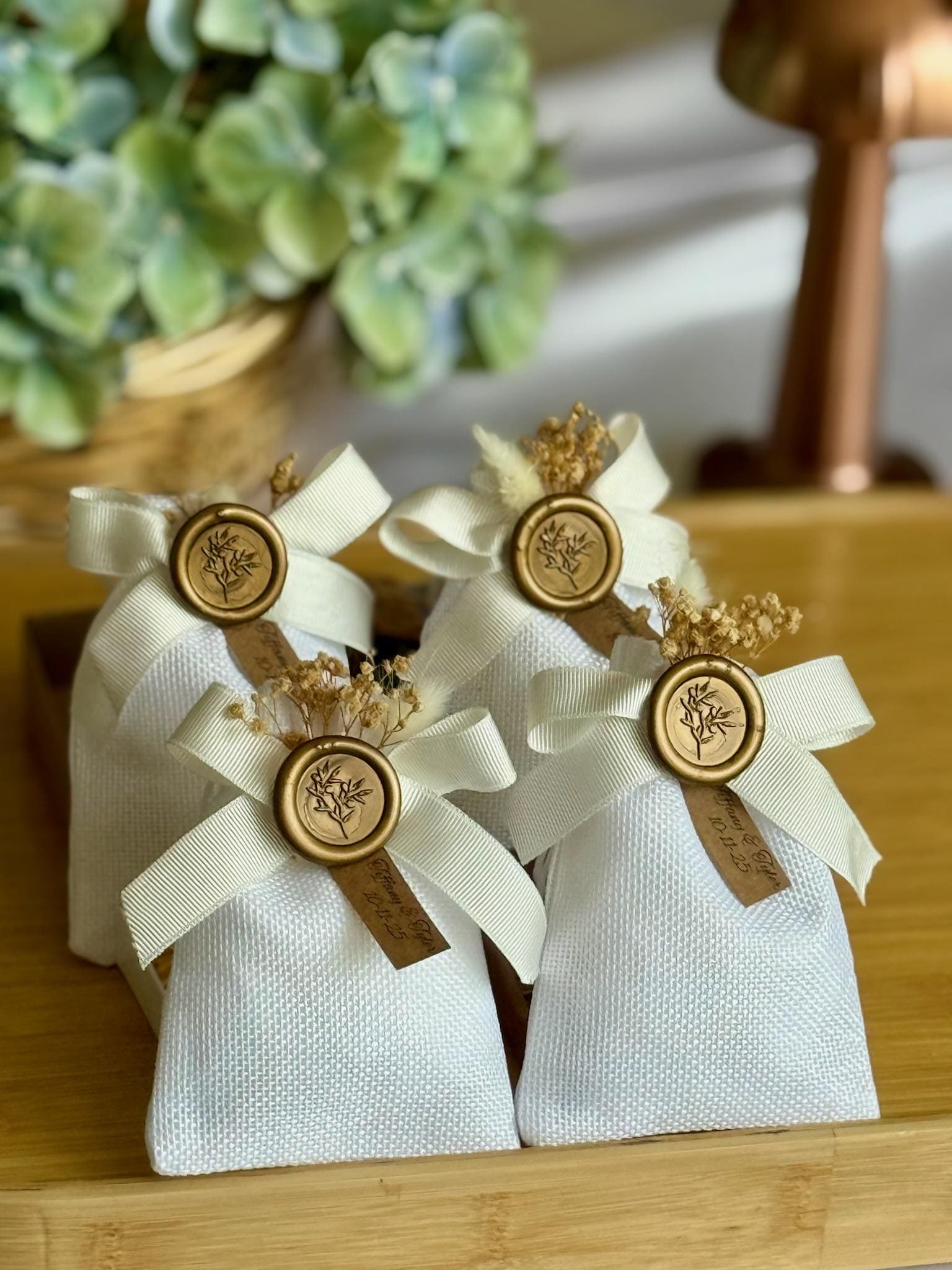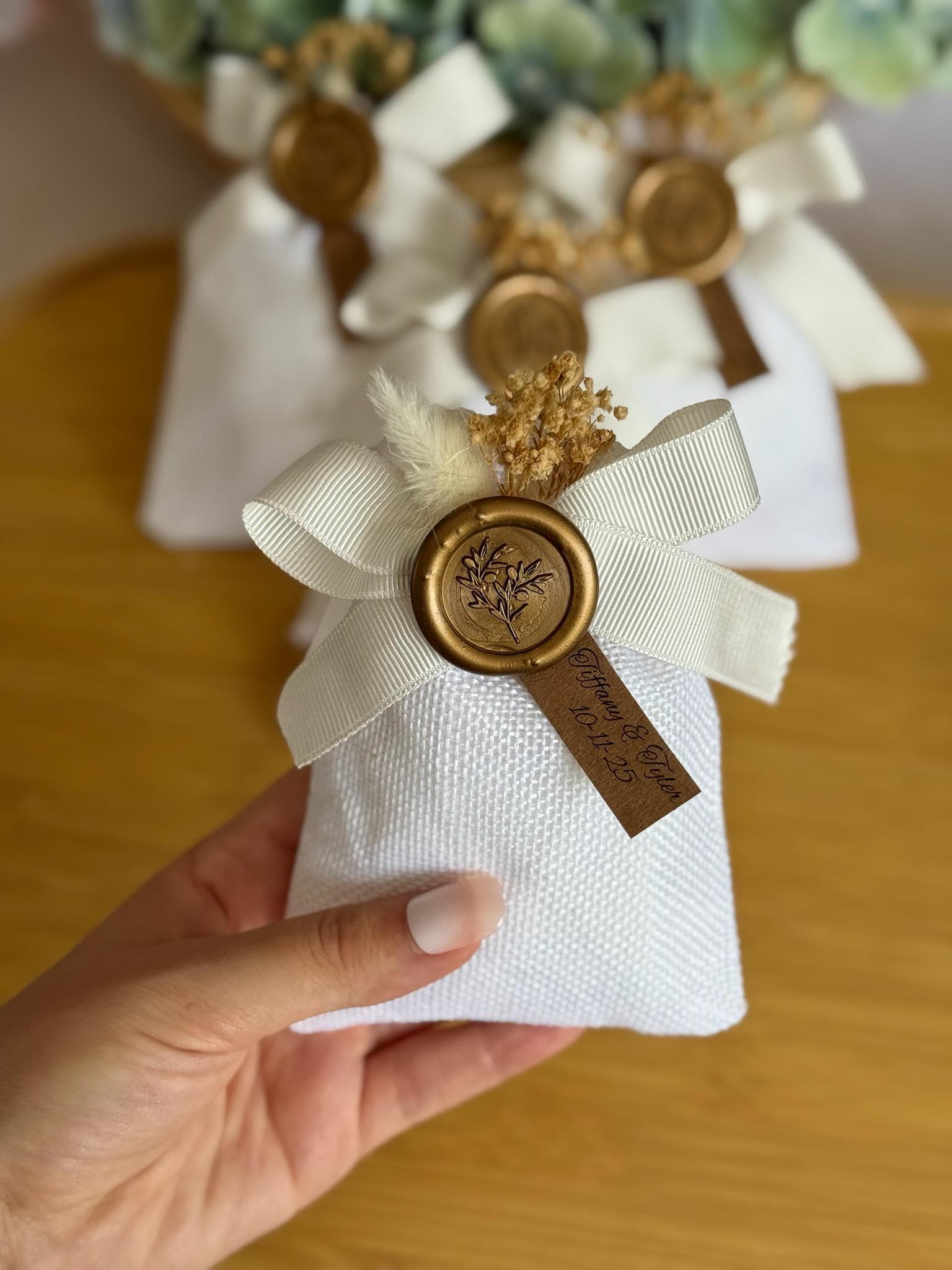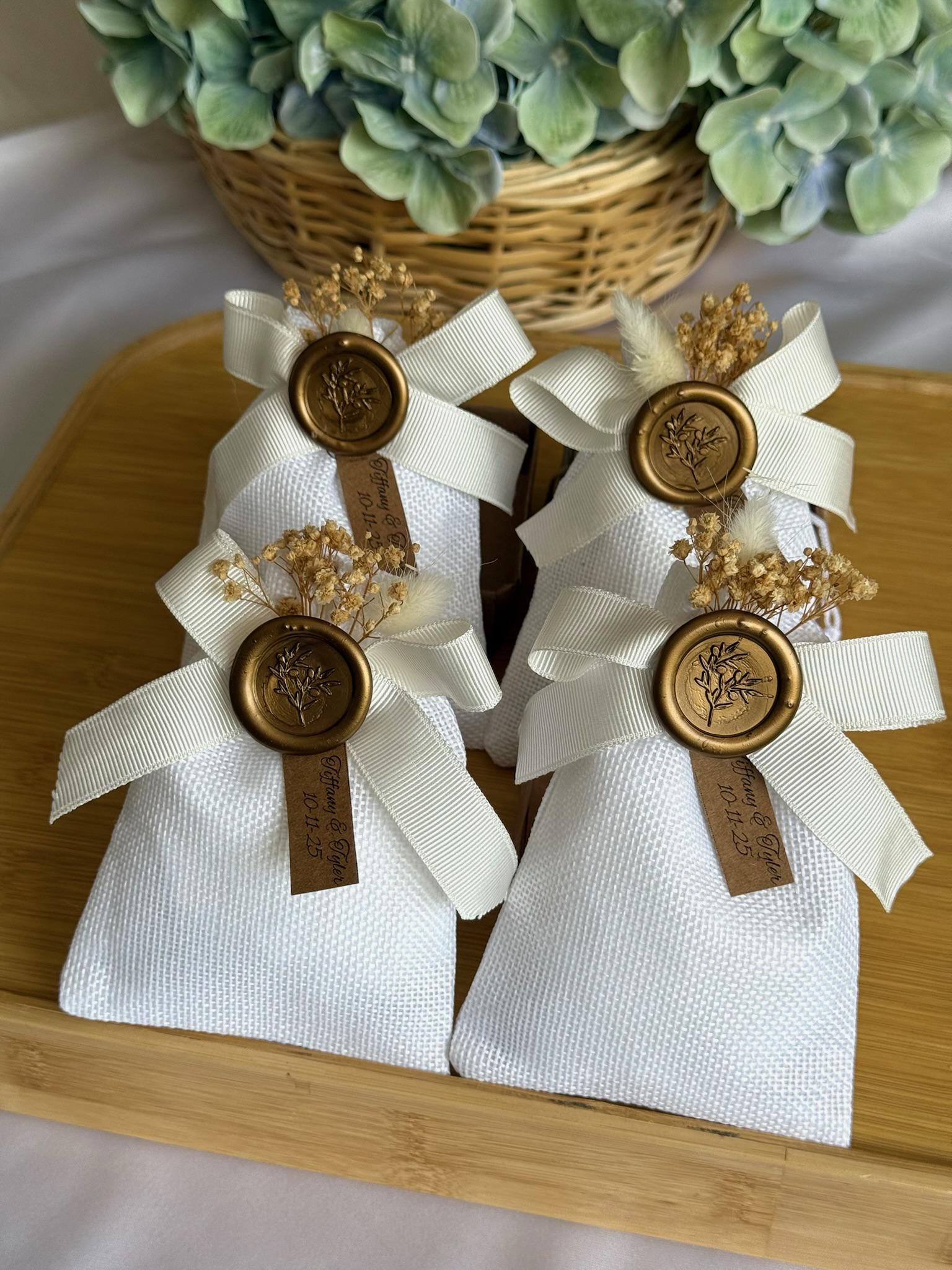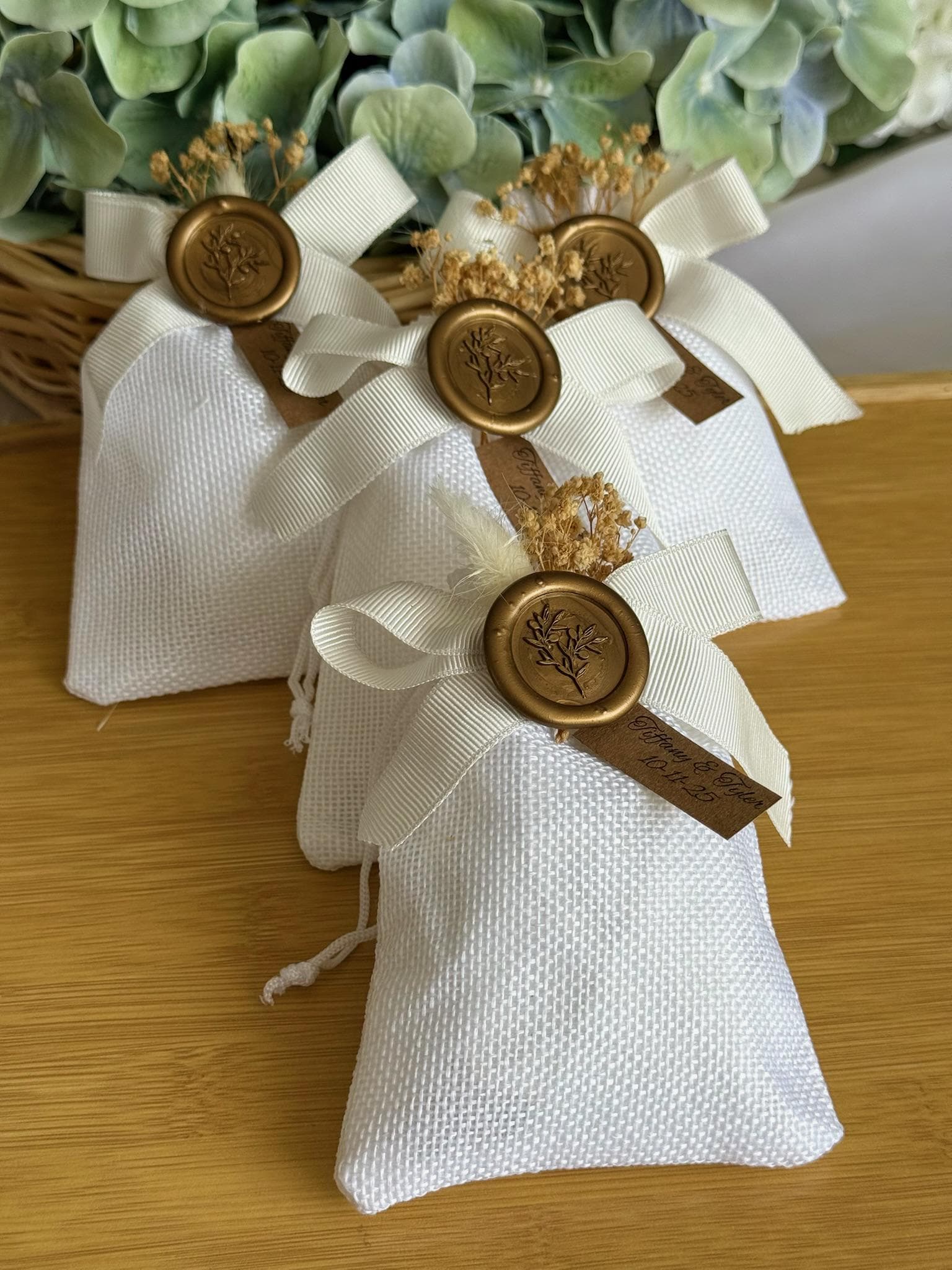 Add a touch of rustic elegance to your special day with these handmade favor sachets. Each pouch is crafted from white fabric and decorated with an ivory ribbon, dried flowers, and a gold wax seal featuring a delicate leaf design. Personalized tags make these favors unique and memorable for your guests.