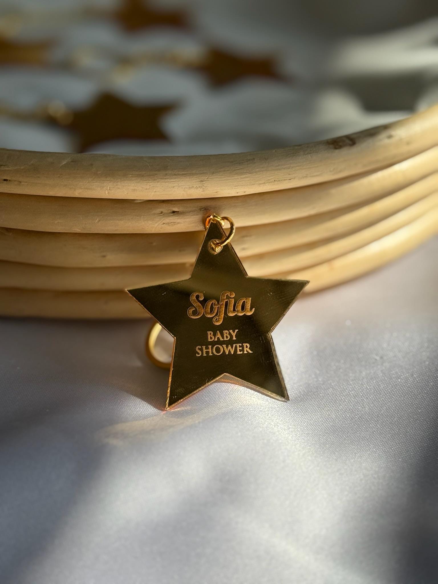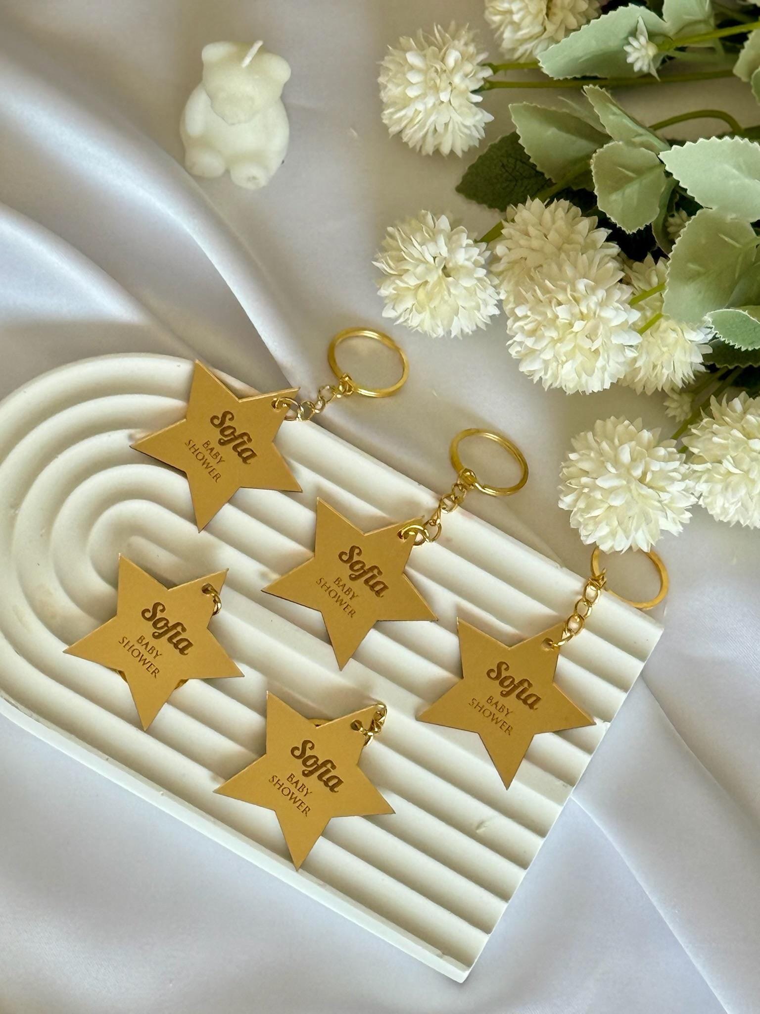 Make your celebration unforgettable with these elegant star-shaped keychains, personalized with your chosen name and event. Perfect as baby shower favors, baptism gifts, wedding keepsakes, or birthday souvenirs. Each piece is crafted with care, available in gold or silver tones, and will leave your guests with a lasting memory of your special day.