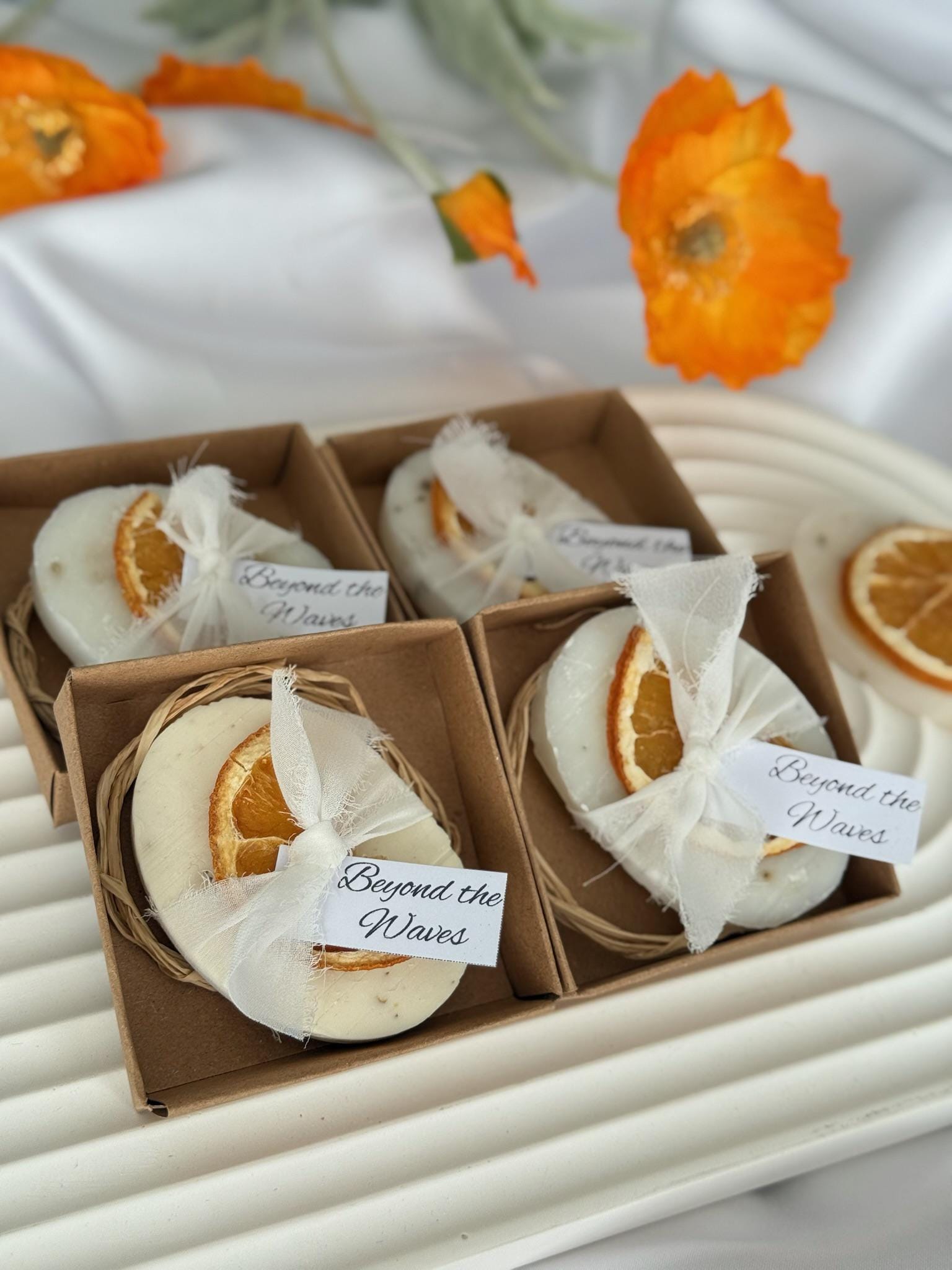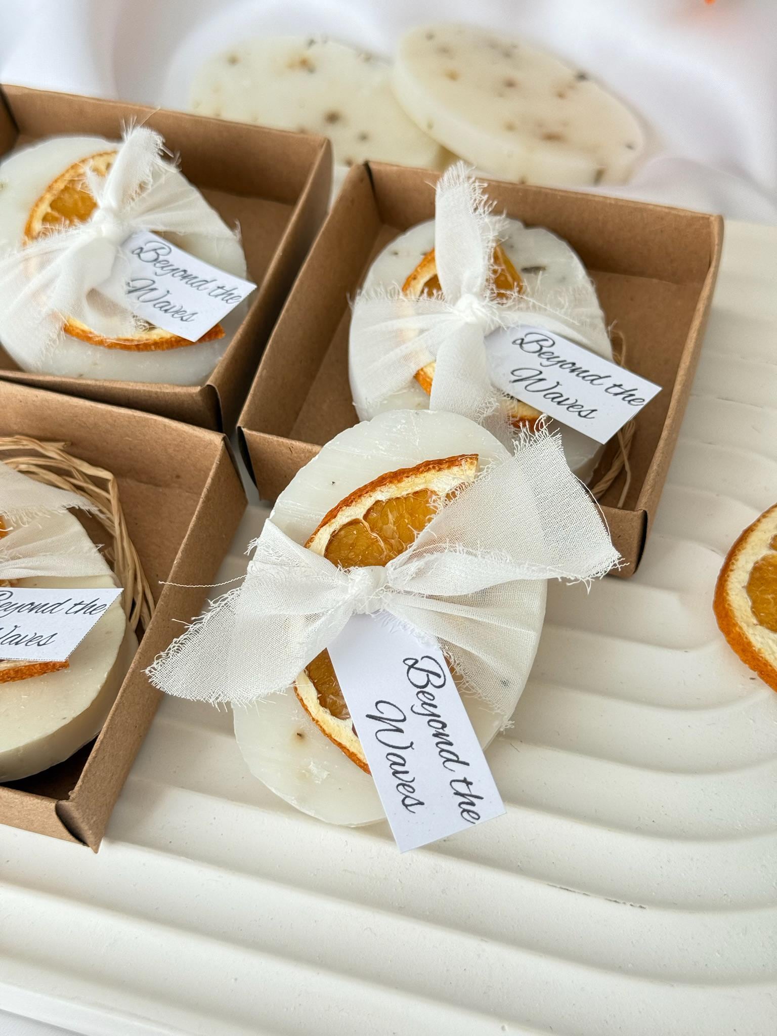 A beautifully handcrafted soap enriched with natural herbs and adorned with a dried orange slice. Wrapped elegantly with a soft ribbon and tag, it’s perfect as a wedding favor, gift, or a luxurious treat for yourself.